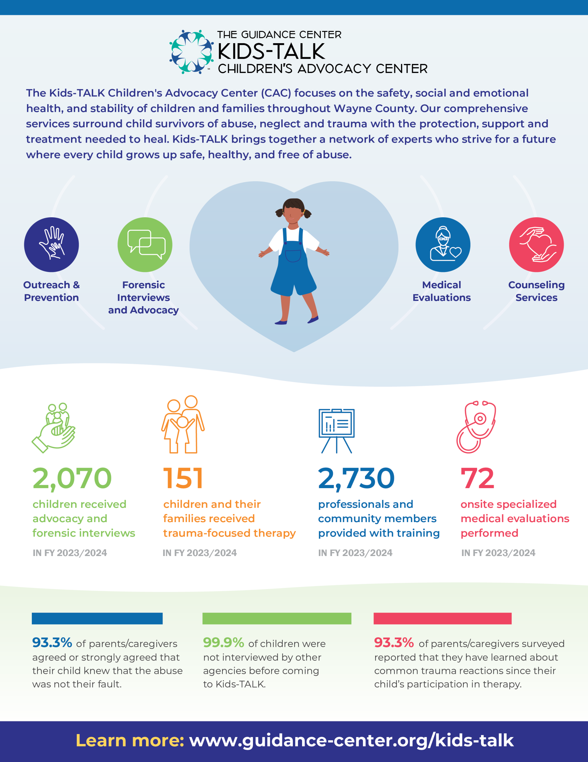 Throughout Wayne County, the Kids-TALK CAC serves children through age 17 and their protective family members at two child-friendly facilities in Southgate and Detroit. Services include forensic interviewing, advocacy, onsite medical evaluations, mental health services, and outreach and prevention programming. Please visit the For Families and Caregivers section below to learn more about these services.